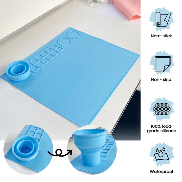 A 100% élelmiszeripari minőségű szilikonból készült, vízálló, tapadásmentes és csúszásmentes szőnyeg tökéletes minden kézműves igényedhez. A 14 mélyedéssel és keverőfelülettel tökéletes a kellékek rendszerezéséhez.